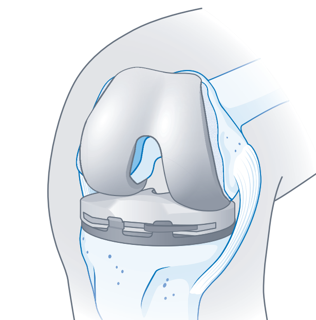 Ein Oberflächenersatz kommt infrage, wenn mehrere Gelenkabschnitte (innerer und äußerer Anteil) betroffen sind; bei zusätzlicher Schädigung des kniescheibenseitigen Gelenkabschnitts wird dieser ggf. mitersetzt.